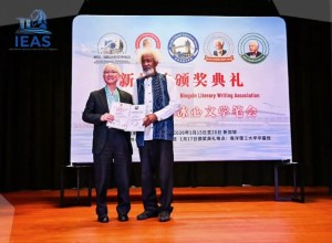 諾貝爾文學獎得主沃莱·索因卡向作家郭曼武(楊柳)授發國際冰心文學獎及世界華語文學獎